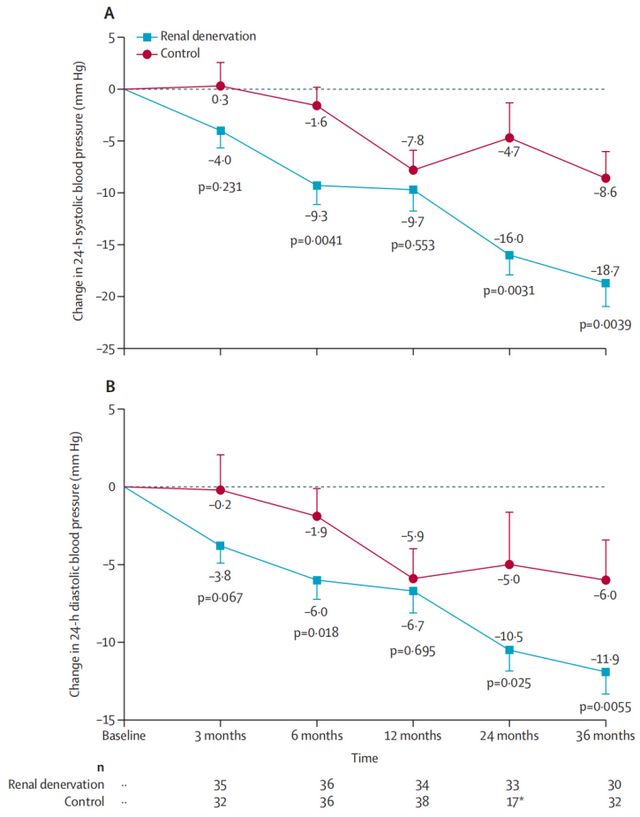 SPYRAL HTN-ON MED试验中24小时血压从基线到36个月的平均变化。图片来源:Mahfoud F, et al. Lancet. 2022 Apr 9;399(10333):1401-1410.