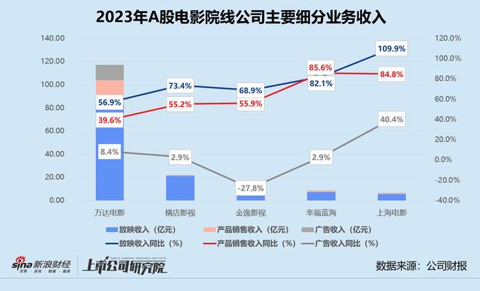 对于院线公司而言,电影放映、广告和影院商品及餐饮销售是主要收入来源。2023年,万达电影的电影放映收入同比增长56.9%至84.45亿元,占当期总营收比例57.8%,较2022年提升2.5个百分点。横店影视、金逸影视、幸福蓝海和上海电影的放映收入合计不超过46亿元,约为万达电影同指标的54.4%。