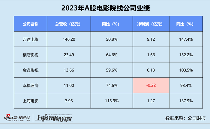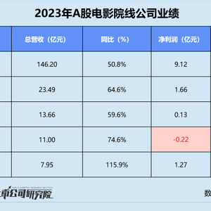 截至4月30日,A股的多家影视公司均已发布2023年业绩报告。万达电影、横店影视、金逸影视、幸福蓝海、上海电影5家院线公司总营收为202.29亿元,同比增长55.9%。除了幸福蓝海仍陷亏损,其余4家公司归母净利润共实现12.18亿元。