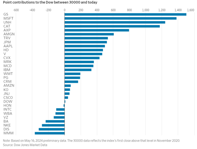 值得一提的是,道指在2020年11月突破了30000点大关,历经873个交易日才突破了40000点。这期间,AI赛道火爆,美国众科技巨头风光无限,但对道指涨幅贡献最大的却是高盛,其次是美国最大的商业健康险公司联合健康。