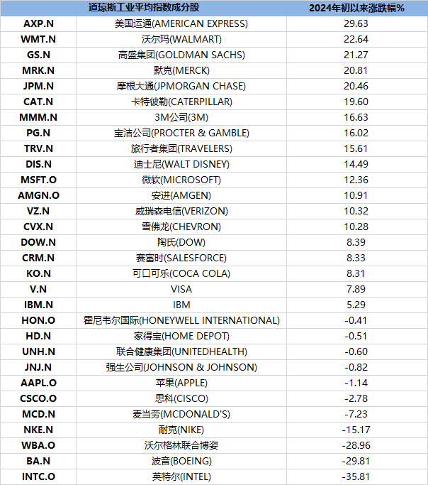 截至最新,道指30只成分股及年初以来涨幅如下:
