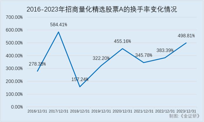 数据显示,以1年为1个周期进行考察时,2016-2023年各年年末,招商量化精选股票A的换手率分别为278.38%、584.41%、157.24%、322.2%、455.16%、345.78%、383.39%、498.81%。