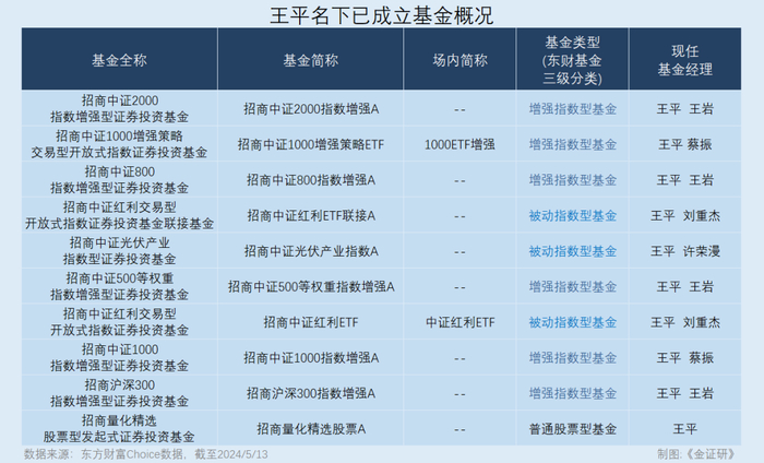 据东方财富Choice数据,截至2024年5月13日,王平正在管理的增强指数型基金中,招商中证2000指数增强型证券投资基金(简称“招商中证2000指数增强A”)、招商中证800指数增强型证券投资基金(简称“招商中证800指数增强A”)、招商中证500等权重指数增强型证券投资基金(简称“招商中证500等权重指数增强A”)、招商沪深300指数增强型证券投资基金(简称“招商沪深300指数增强A”),系其与基金经理王岩共同管理的产品;招商中证1000增强策略交易型开放式指数证券投资基金(简称“招商中证1000增强策略ETF”)、招商中证1000指数增强型证券投资基金(简称“招商中证1000指数增强A”)两只基金为王平与蔡振一同管理的基金。