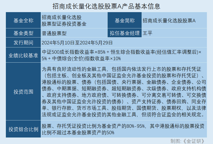 《招商成长量化选股股票型证券投资基金基金份额发售公告》显示,招商成长量化选股股票A原定的发售期为2024年5月6日至2024年5月24日,为契约型开放式、股票型基金。《招商成长量化选股股票型证券投资基金招募说明书》显示,招商成长量化选股股票A的拟任基金经理为王平。