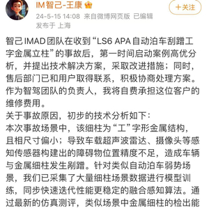 智己LS6自动泊车刮蹭立柱!智驾负责人:自费承担客户修车费