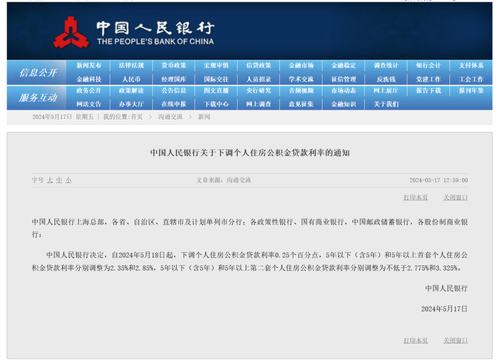 中国人民银行此次还决定自2024年5月18日起,下调个人住房公积金贷款利率0.25个百分点。其中,5年以下(含5年)和5年以上首套个人住房公积金贷款利率分别调整为2.35%和2.85%;5年以下(含5年)和5年以上第二套个人住房公积金贷款利率分别调整为不低于2.775%和3.325%。