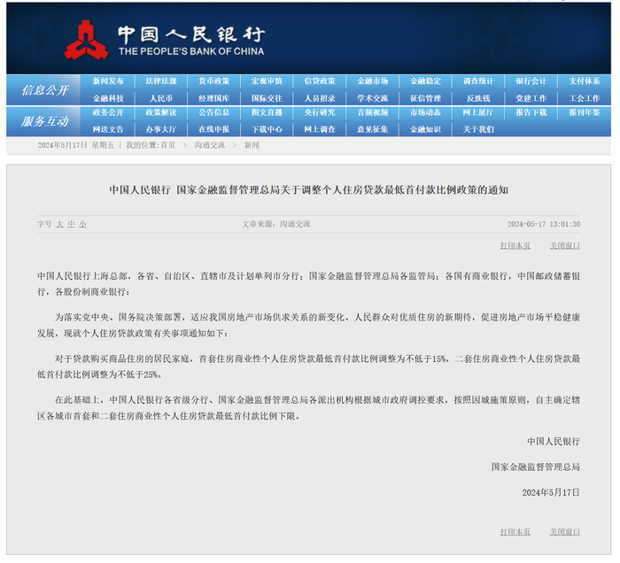 中国人民银行于5月17日还发布了调整个人住房贷款最低首付款比例政策的最新通知,对于贷款购买商品住房的居民家庭,首套住房商业性个人住房贷款最低首付款比例调整为不低于15%,二套住房商业性个人住房贷款最低首付款比例调整为不低于25%。在此基础上,中国人民银行各省级分行、国家金融监督管理总局各派出机构根据城市政府调控要求,按照因城施策原则,自主确定辖区各城市首套和二套住房商业性个人住房贷款最低首付款比例下限。