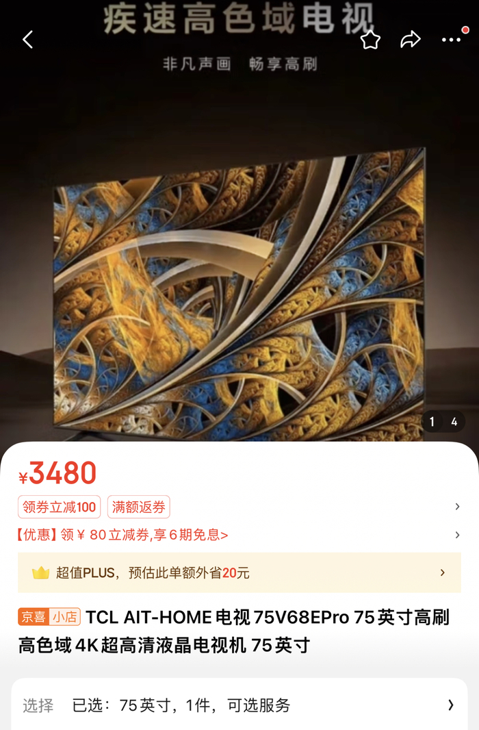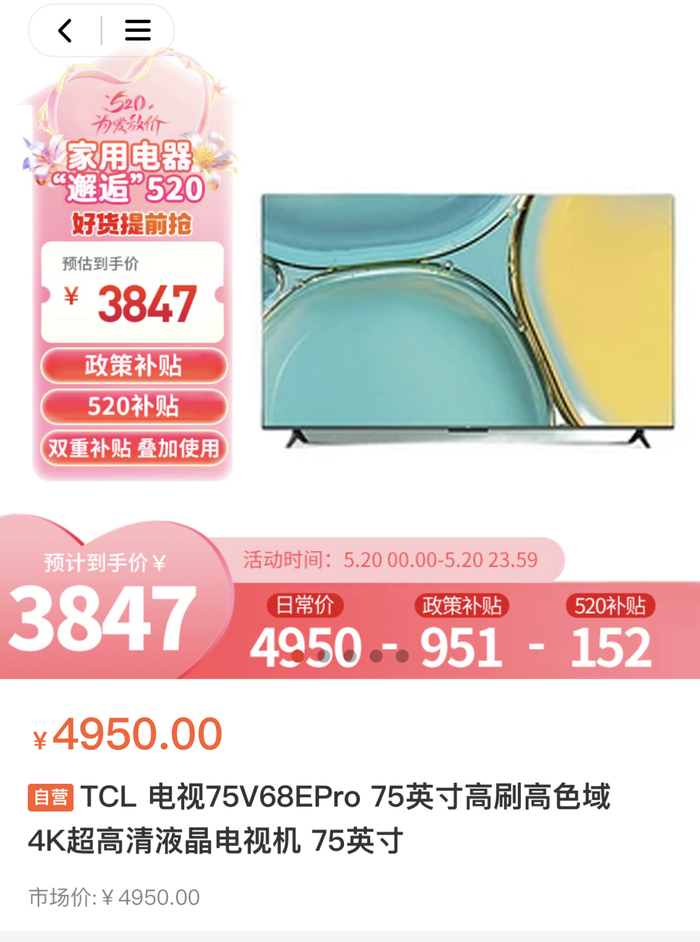 比如一款型号为75V68E PRO的75英寸TCL牌液晶电视,原价4950元,补贴后的价格为3847元;而同样型号的电视机在京东App上的最低价格却为3480元。一款Pura 70 pro+ 16+512G型号的华为手机,该平台售价8399元,京东平台上商家售价为7999元。