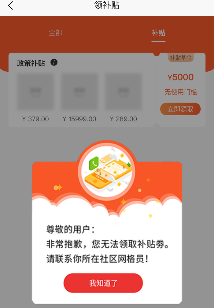 记者尝试不通过扫码,从App内直接点击领取优惠券,但是失败了。此后记者从平台核实到,如果领取优惠,必须联系所在社区的网格员获取专属二维码。
