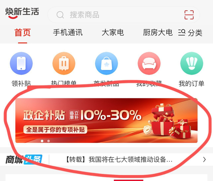 记者注意到,该“焕新生活”App官方介绍显示,这是一款主要为居民生活焕新升级提供购买家居建材、家电、厨电洁具等产品服务的平台。在该APP首页位置,显著标明:政企补贴,每单立补10%-30%。