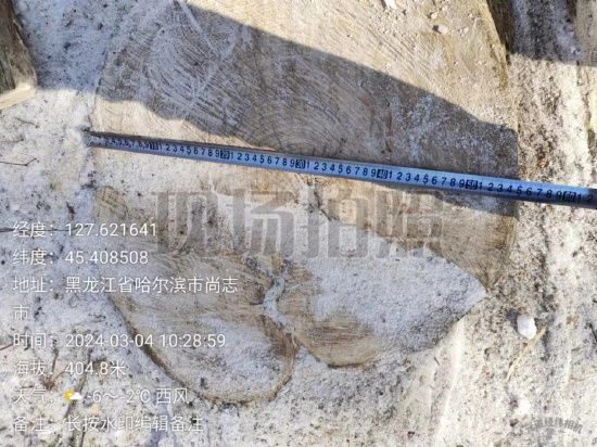 在投诉人提供的相关证据材料中,指尖新闻记者看到,视频最早的拍摄时间是今年3月,当时林场内的积雪尚未融化。视频中,一处作业场地里存放了大批加工后的水曲柳树干,其中部分水曲柳的直径在40厘米左右。而在几张对水曲柳根桩的测量图片中,最粗的一个根桩的直径达到了56厘米。投诉人称,这种直径在60厘米左右的水曲柳,树龄应该在百年左右。