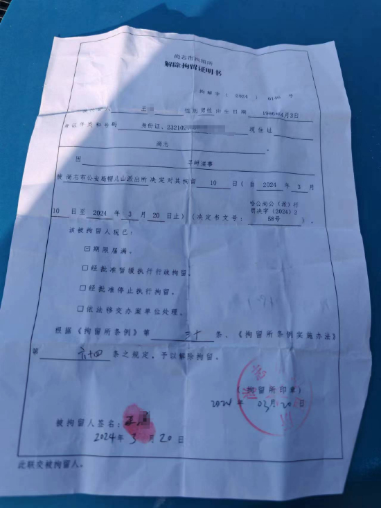 王先生称,他之所以要进行举报,是因为最开始帽儿山林场是对外公告销售风灾木,他因为风灾木不值钱,便没有参与竞价。但是他后来发现,林场采伐的大部分不是风灾木,便准备拍视频进行取证,然后进行举报。在王先生提供的《解除拘留证明书》上,指尖新闻记者看到,王先生被行政拘留10日的理由是“寻衅滋事”。王先生称,他是向哈尔滨12345
