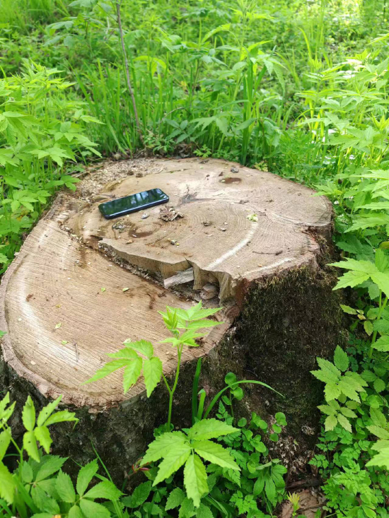 △被砍伐水曲柳直径与手机对比图(记者 刘强 摄)