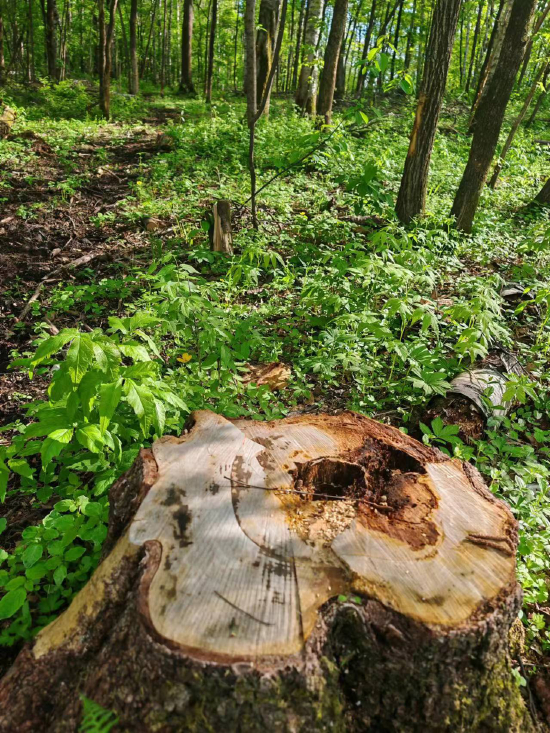 5月16日,指尖新闻记者到尚志市实地核实时发现,帽儿山林场内确实存在大量水曲柳近期被砍伐后留下的根桩。尚志市林草局未正面回复指尖新闻的采访。