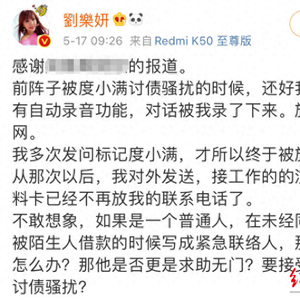 据媒体报道,中国台湾女星刘乐妍自述,陌生人周某在度小满借贷时,紧急联系人留了她的姓名、电话。因周某欠钱不还,度小满频繁致电并发短信给她,让她提醒周某还款。尽管刘乐妍已反复说明自己不认识周某,催债人员仍不分昼夜地对她进行骚扰。