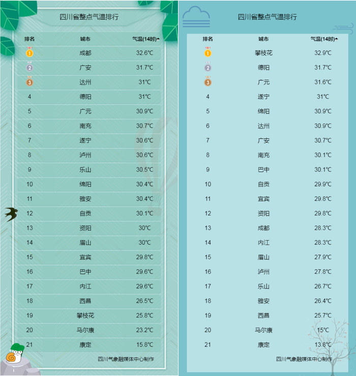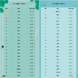 最近这两天,天气有点热。四川省气象台观测到的14时实况气温显示,5月16日全省有14个城市超过30℃,5月17日有12个城市超过29.5℃。