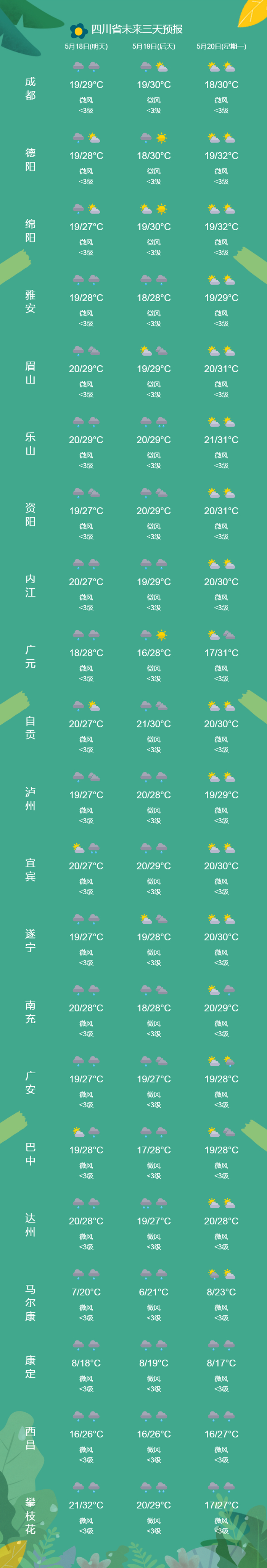 四川省气象台今天16时发布最新天气预报:未来三天,盆地大部地方有阵雨或雷雨,西南部、南部局部有中雨;川西高原和攀西地区阴天间多云有阵雨(雪)或雷雨,局部中到大雨。