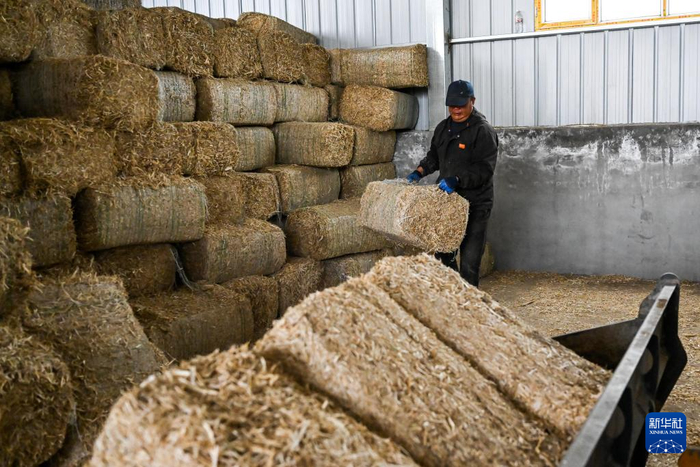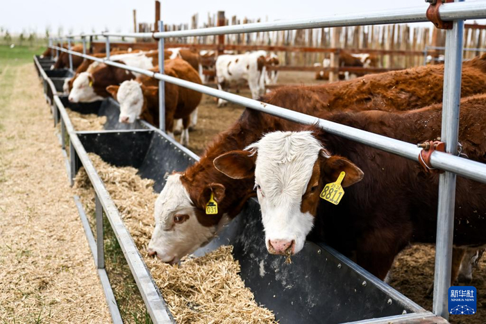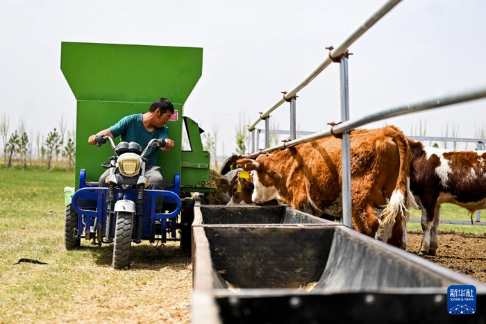 5月16日,牧民在西乌珠穆沁旗吉仁高勒嘎查股份经济合作社给肉牛喂饲料。