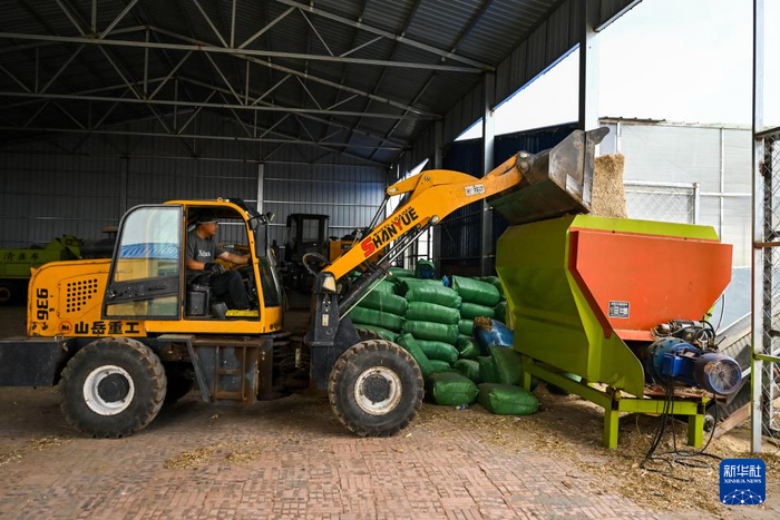 5月16日,牧民在西乌珠穆沁旗吉仁高勒嘎查股份经济合作社驾驶铲车将草料倒入搅拌设备。