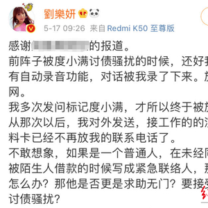 据媒体报道,中国台湾女星刘乐妍自述,陌生人周某在度小满借贷时,紧急联系人留了她的姓名、电话。因周某欠钱不还,度小满频繁致电并发短信给她,让她提醒周某还款。尽管刘乐妍已反复说明自己不认识周某,催债人员仍不分昼夜地对她进行骚扰。