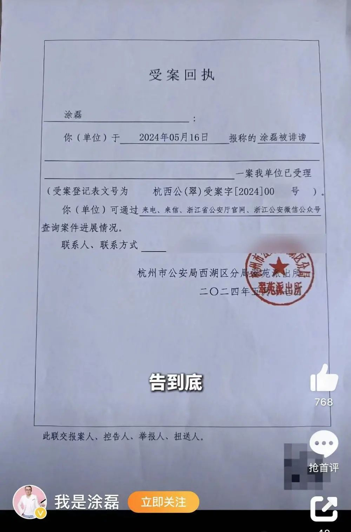天(5月17日)17日,涂磊发视频回应道:拒绝造谣,人人有责!他痛斥该网友,句句造谣,绘声绘色,令人发指!涂磊在视频中公开了受案回执,并称,目前他已经报案,一定要对簿公堂,告到底。