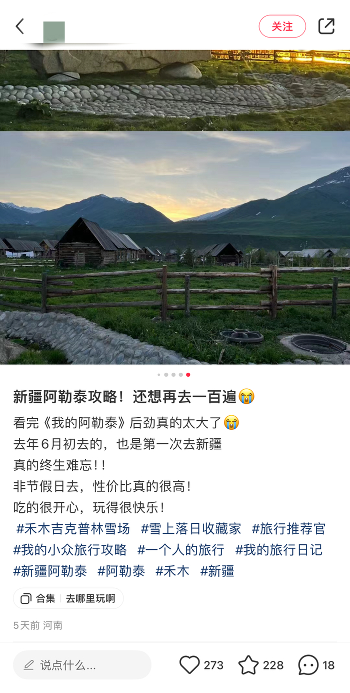 “看完《我的阿勒泰》,后劲太大了,已经迫不及待想去北疆的牧场上奔跑了”。福建泉州的黄佳计划在暑期假期之前,带父母去一趟新疆阿勒泰,“最近看到很多朋友报了下个月的旅游团,我也给自己和爸妈报了一个。”