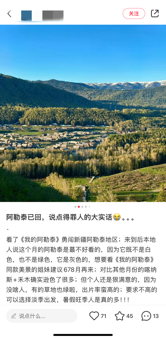 值得一提的是,在社交平台上,也有不少“第一批”前往阿勒泰的网友表示当前的景色并不像电视剧里那么好看,建议等到暑期再来。