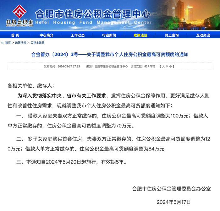 5月17日,合肥市发布《关于调整我市个人住房公积金最高可贷额度的通知》。通知提出,借款人家庭夫妻双方正常缴存的,住房公积金最高可贷额度调整为100万元;借款人单方正常缴存的,住房公积金最高可贷额度调整为70万元。多子女家庭购买首套住房,夫妻双方正常缴存的,住房公积金最高可贷额度调整为120万元;借款人单方正常缴存的,住房公积金最高可贷额度调整为84万元。