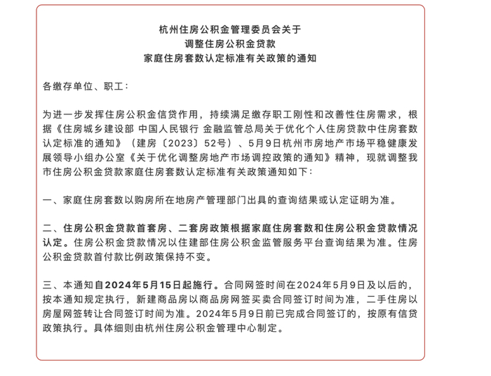 5月17日,杭州住房公积金管理委员会发布关于调整住房公积金贷款家庭住房套数认定标准有关政策的通知。通知提出,家庭住房套数以购房所在地房产管理部门出具的查询结果或认定证明为准。住房公积金贷款首套房、二套房政策根据家庭住房套数和住房公积金贷款情况认定。住房公积金贷款情况以住建部住房公积金监管服务平台查询结果为准。住房公积金贷款首付款比例政策保持不变。