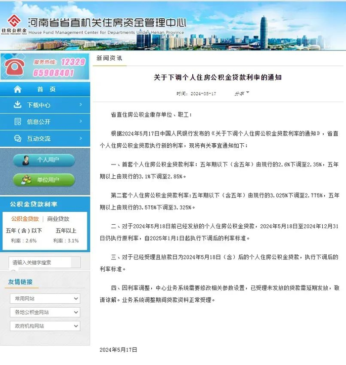 5月17日,河南省省直机关住房资金管理中心发布通知明确,对于购买首套住房的购房者,五年期以下(含五年)和五年期以上的贷款利率分别下调至2.35%和2.85%。购买第二套住房的购房者,五年期以下(含五年)和五年期以上的贷款利率分别下调至2.775%和3.325%。