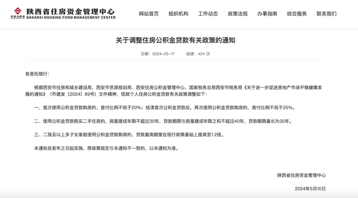 5月17日,陕西省住房资金管理中心发布《关于调整住房公积金贷款有关政策的通知》。通知提出,首次使用公积金贷款购房的,首付比例不低于20%;结清首次公积金贷款后,再次使用公积金贷款购房的,首付比例不低于25%。使用公积金贷款购买二手住房的,房屋建成年限不超过30年,贷款期限与房屋建成年限之和不超过40年,贷款期限最长为30年。二孩及以上多子女家庭使用公积金贷款购房的,贷款最高额度在现行政策基础上提高至1.2倍。