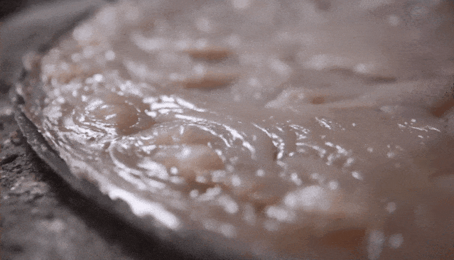 最费力气的部分需有男人来完成。高温下不停搅拌,淀粉持续糊化。一小时后,形成质地均匀的胶状。