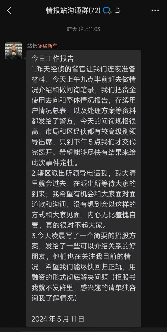 澎湃新闻记者通过截图看到,5月10日傅某在群里称:“个人认为处理当下问题的最优解:第一步复产复工;第二步借款200万处理部分问题;第三步快速出售股份解决全部问题。”5月11日,傅某称已配合经侦和辖区派出所的调查,并写好了简要的招股方案,希望用融资的形式彻底解决问题,感兴趣的可单独咨询。5月13日,傅某在更新了前一日的工作报告后,再未继续更新,引起了用户的担忧。