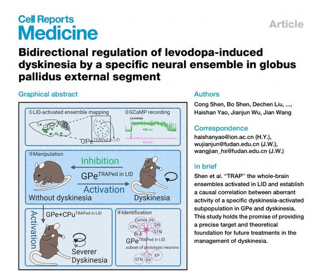 近日,复旦大学附属华山医院国家老年疾病临床医学研究中心PI、复旦大学附属华山医院神经内科王坚课题组联合中国科学院脑科学与智能技术卓越创新中心姚海珊课题组在Cell Reports Medicine在线发表了题为“Bidirectional regulation of levodopa-induced dyskinesia by a specific neural ensemble in globus pallidus external segment”的研究成果。复旦大学附属华山医院沈聪博士、沈博博士及中国科学院脑科学与智能技术卓越创新中心的刘德陈博士后为本文的第一作者。Cell Reports Medicine系Cell旗下子刊,最新的影响因子为14.3。