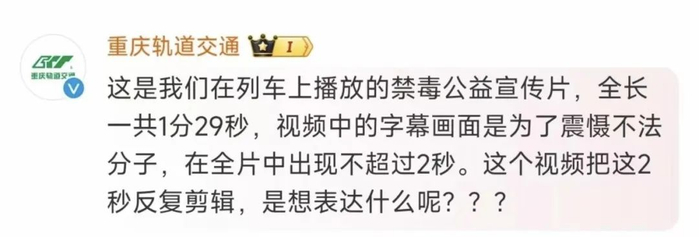 针对恶意剪辑造成的网络舆情,重庆轨道交通无奈回应:“这是我们在列车上播放的禁毒公益宣传片,全长一共1分29秒,视频中的字幕画面是为了震慑不法分子,在全片中出现不超过2秒”。