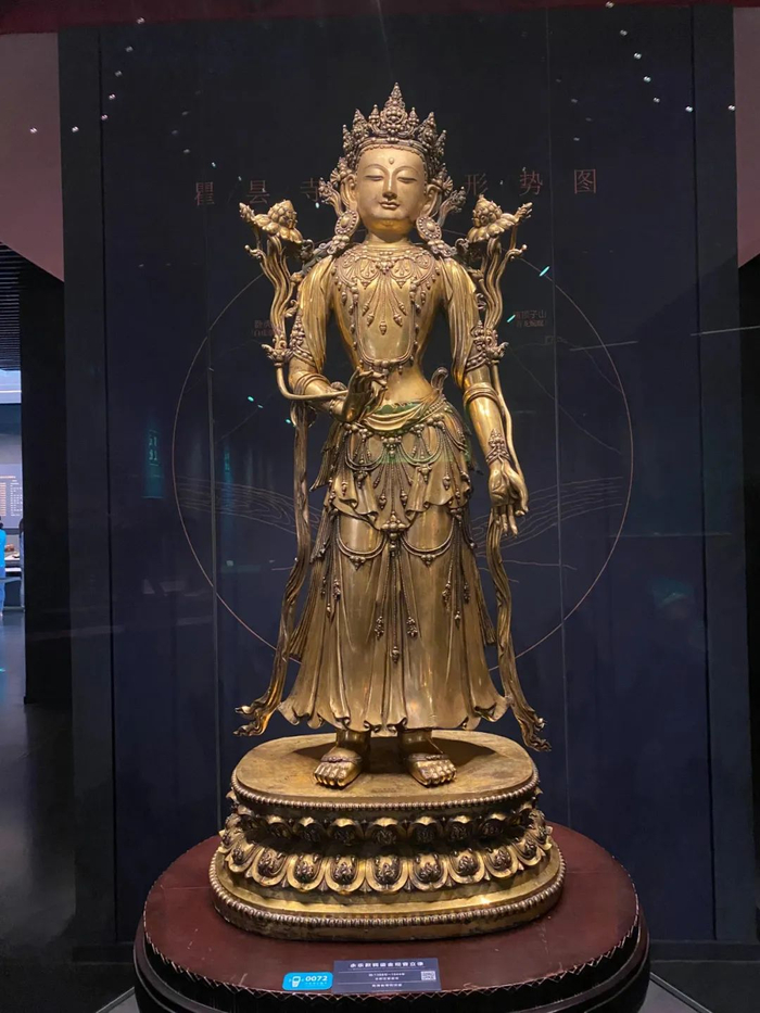 国宝级文物。由明朝皇帝赐给青海著名的瞿坛寺。像高146厘米,身姿婀娜,站立在莲花座上。衣饰线条流畅飘逸,面含微笑,表情慈和,遍体鎏金。其铸造工艺代表了明代的最高技术水平。