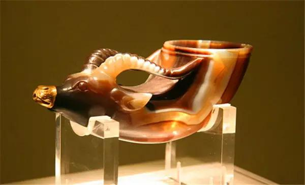 镶金兽首玛瑙杯,是至今所见唐代唯一的一件俏色玉雕,也是唐代玉器作工最精湛的一件,此杯选用世界上极为罕见的红色玛瑙琢制,而兽嘴镶金的工艺处理,也是匠心独运,它金光闪闪,克服了兽嘴处材质色泽太深的不足,使兽头的造型之美更为突出。