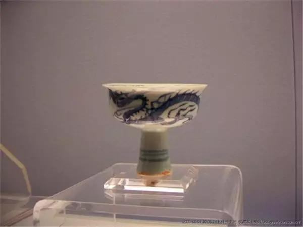 元代青花云龙纹高足碗,该器物侈口,深腹。高圈足上有三道凸弦纹,呈竹节状。口沿为青花唐草纹。内壁暗花印行龙二条。外壁用青花绘一游龙,并衬以火焰纹。青花色泽青翠浓艳,线条流畅有力,堪称元代青花瓷器中的珍品。