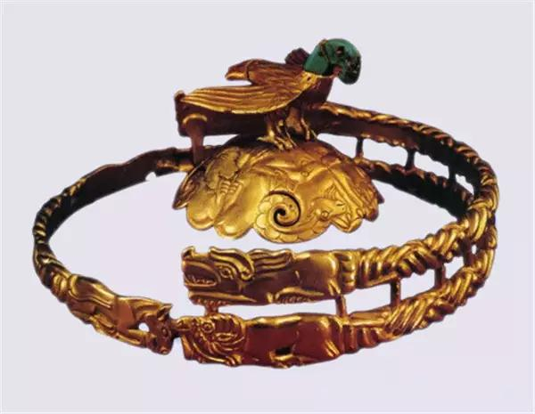 国宝级文物。黄金制成,重1394克,是迄今发现的唯一一件匈奴单于金冠。金冠由金鹰和冠带两部分组成,上面浮雕有羊和狼的图案,雄鹰站在半球形金冠顶上,俯视着冠带上狼与羊搏斗的情景。