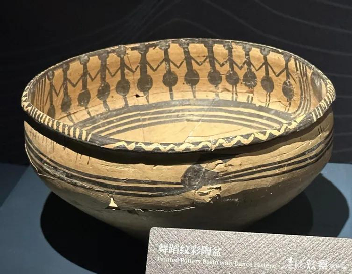 这件宗日遗址出土马家窑文化马家窑类型舞蹈纹彩陶盆,最引人注目的地方是内壁上描绘的人形舞蹈图案,舞蹈人像分为两组,一组13人,另一组11人,共24人,是现存同类文物中舞蹈形象人数最多的一件,舞者头戴头饰,身着裙装,正手拉着手跳着欢快的舞蹈。