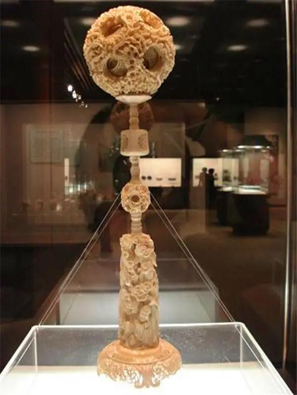 全高52.2厘米,上为一直径12.9厘米的大球,镂雕祥云缭绕,十余条健龙或藏头露尾、或藏尾露首穿行于云层之间;大球内分层透雕二十一个小球,球球相套,层层能转,满地纹饰。三节台柱,上为六层透雕小象牙球,纹饰同顶上之大象牙球;下有四足座,座上雕人物顶柱状承盘,玲珑剔透巧夺天工的雕刻工艺令人叹为观止。