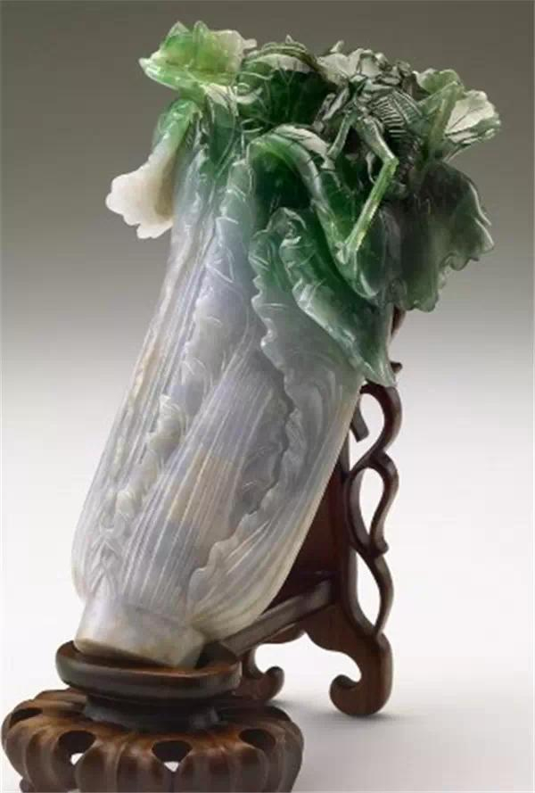 这棵翠玉白菜由一块半白半绿的翠玉为原材料,绿色的部分雕成菜叶,白色部分雕成菜帮,看上去是鲜活欲滴。菜叶上还停留着两只昆虫,它们是寓意多子多孙的螽斯和蝗虫。