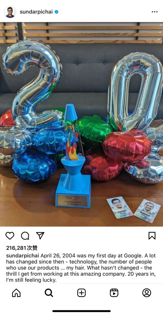 约三周前,谷歌母公司Alphabet兼谷歌CEO桑达尔·劈柴(Sundar Pichai)在个人Instagram上庆祝自己的“Googleversary”,今年是他在谷歌工作的第20年。