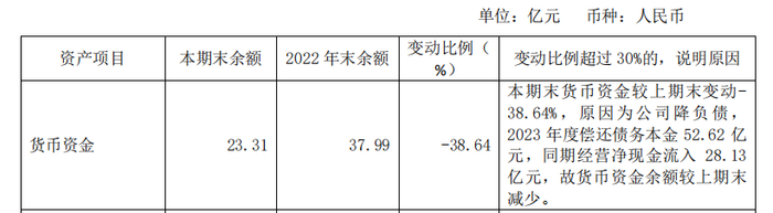 原因在于,华宇集团期内用了较大的持有现金偿还了负债。2023年报显示,该公司偿还债务本金 52.62 亿元,同期经营净现金流入 28.13亿元,故导致货币资金余额较上期末减少。