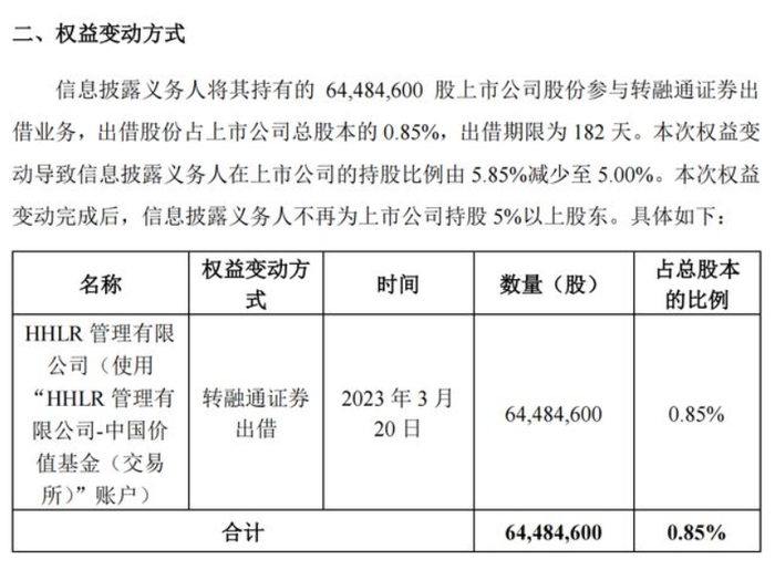 据了解,此前隆基绿能公布的《关于股东参与转融通证券出借业务暨权益变动的提示性公告》显示,2023年3月20日,信息披露义务人(即高瓴旗下HHLR管理有限公司)参与转融通证券出借业务,出借其持有的隆基绿能股份数量6448.46万股,占公司总股本的0.85%,出借期限为182天。该部分股份出借期间不登记在信息披露义务人名下,导致其持股比例由5.85%减少至5.00%。