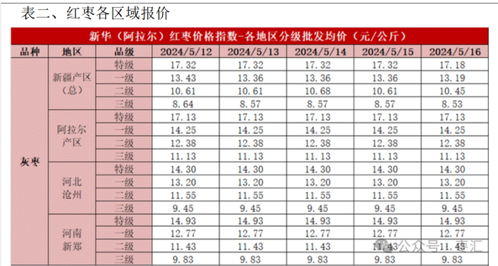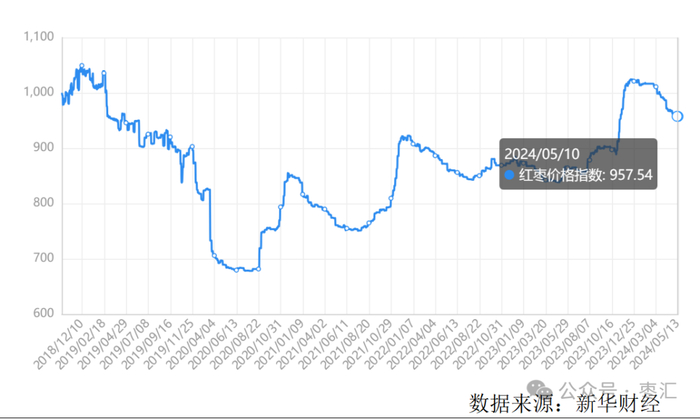 数据显示,截至5月16日,新华(阿拉尔)红枣价格指数报955.43点,周环比下跌0.22%,分地区看,新疆产区红枣价格指数周环比下跌0.65%,批发市场红枣价格指数较上周基本持平。