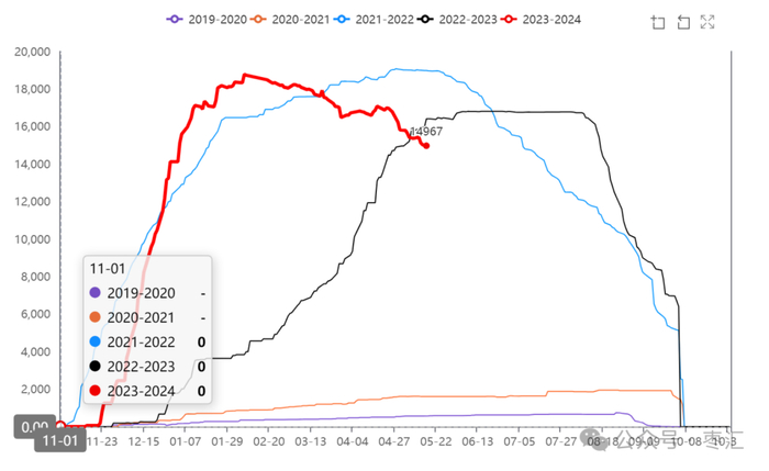 新季枣方面枣树处于快速生长阶段,枣树少量开花,月底预计进入盛花期。今年目前来看天气情况较好,气温回升快,积温较去年高,花期早于去年。新季枣树枝条生长迅速,目前枣树长势正常,枣农积极进行病虫害防治工作。