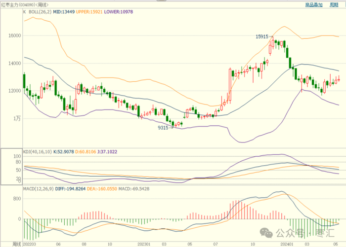 郑枣主力2409合约,周五收盘报12815元/吨,较上周期价上涨50元/吨,周内盘面震荡为主,盘面冲高回落,上方13000附近压力较大,持仓量57902手,较上周增加1535手,持仓增加。技术上,周线级别MACD绿色能量柱收缩,KDJ指标下行,周线级别指标收敛于零轴附近。