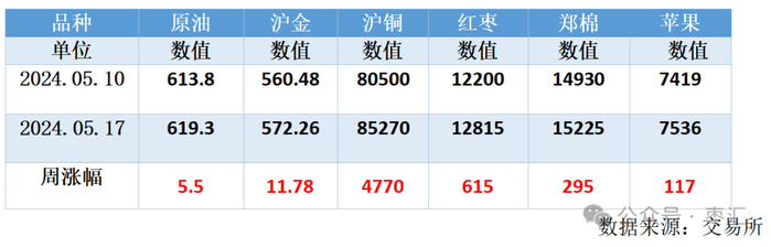 国内主要商品,原油上涨,沪金上涨,铜上涨,红枣上涨,棉花上涨,苹果上涨,商品大多上涨。