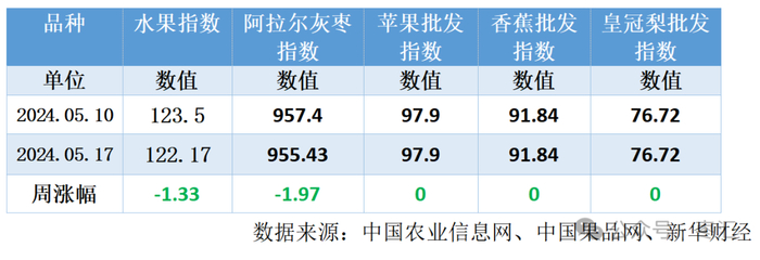 水果指数下跌;灰枣指数下跌;香蕉批发指数较上周持平;苹果批发指数本周较上周持平;皇冠梨较上周持平。